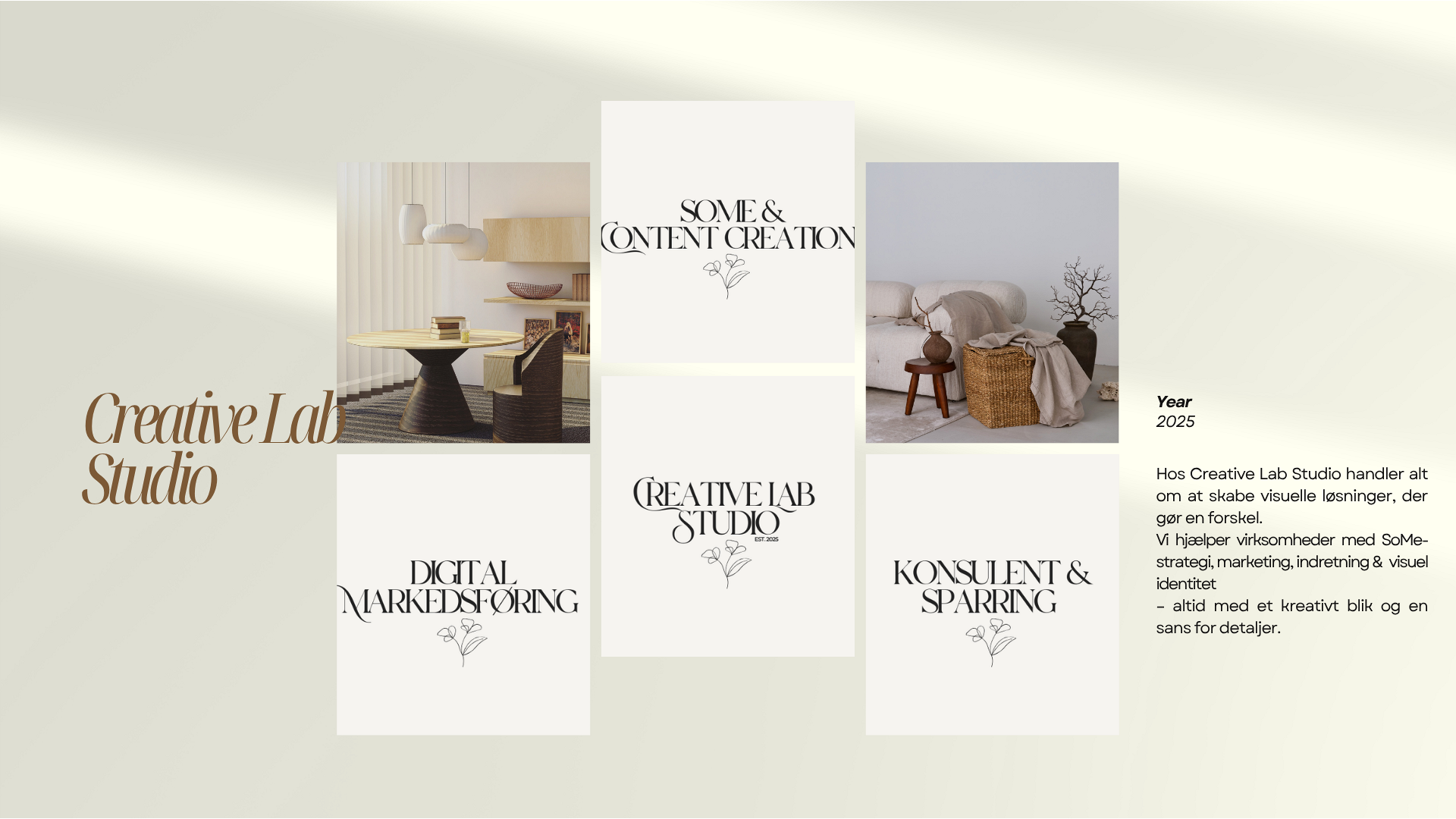 Hos Creative Lab Studio tilbyder vi konsulentbistand, sparring, SoMe-strategi, marketing, indretning og visuel identitet, skræddersyet til din virksomheds behov. Vores mål er at kombinere strategi og kreativitet, så dit brand ikke bare bliver set – men husket.